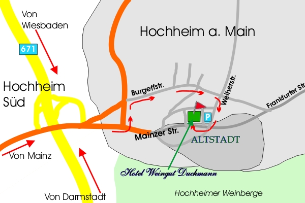 Sie fahren von der A671 aus Wiesbaden oder Darmstadt/Mainz kommend die Ausfahrt Hochheim Süd ab.